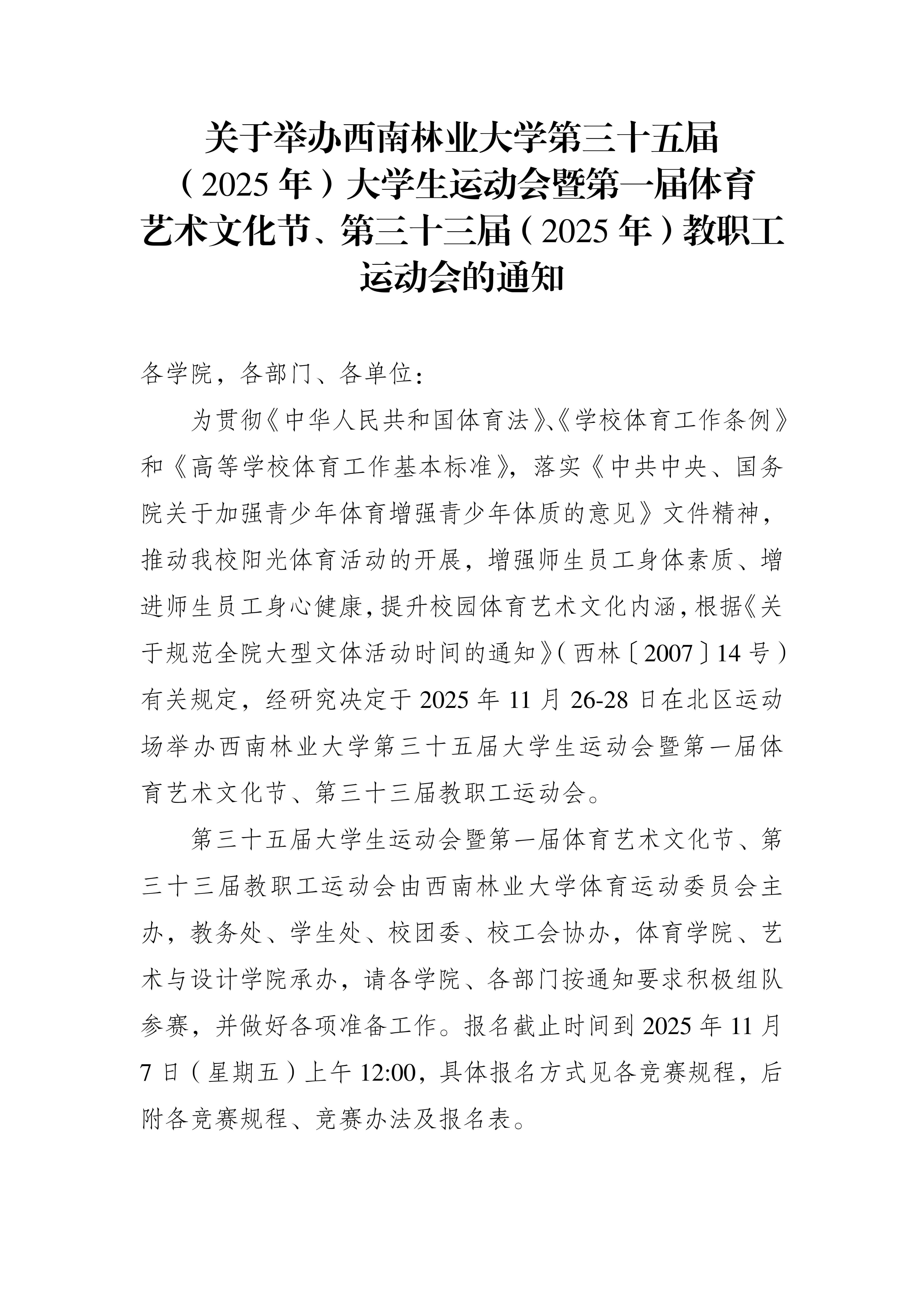 关于举办西南林业大学第三十五届(2025年)大学生运动会暨第一届体育艺术文化节、第三十三届(2025年)教职工运动会的通知